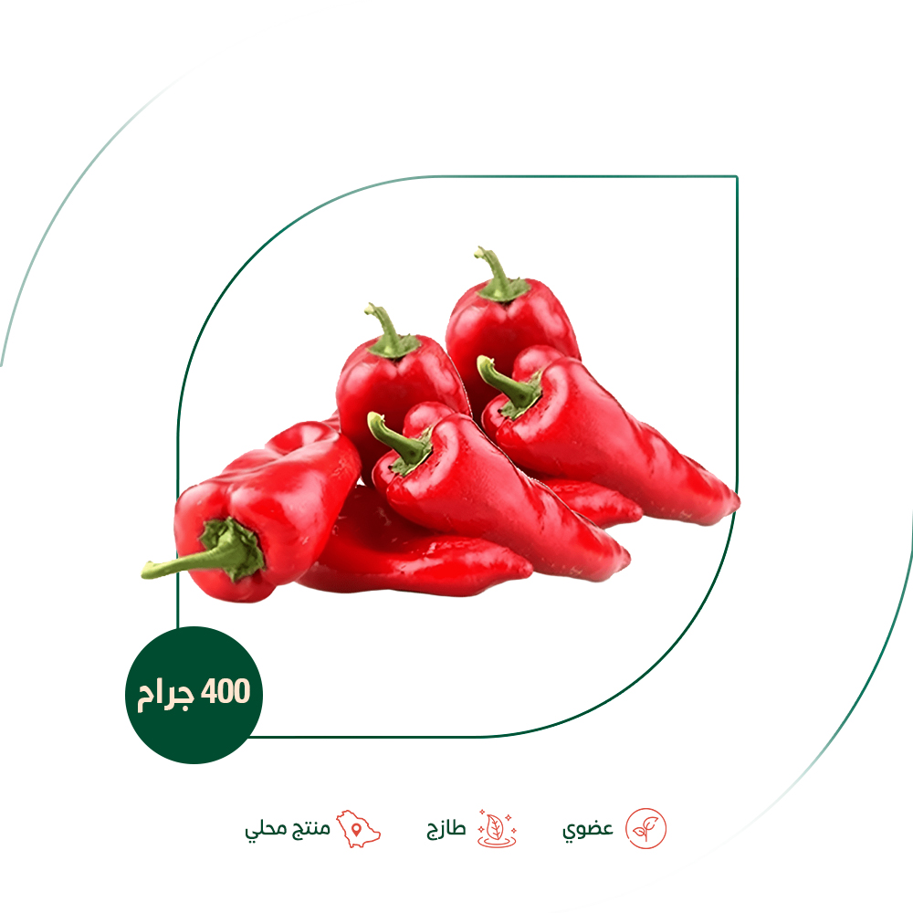 عضوي 100%: يتم زراعة هذا الفلفل المميز باتباع أعلى المعايير العضوية الصارمة، دون استخدام أي مبيدات حشرية أو أسمدة كيميائية، مما يجعله آمناً وصحياً لك ولعائلتك.